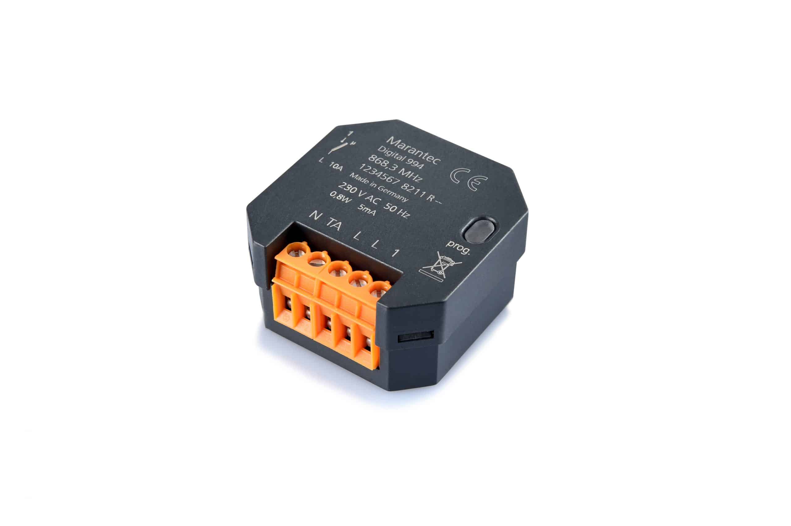 Le Récepteur encastrable MARANTEC Digital 994 868 MHz (Réf : 160280) est un récepteur universel qui a une alimentation de 230 V (AC). Il est équipé d’un canal radio que vous pouvez attribuer librement. De plus, il peut – par exemple – contrôler divers appareils dans votre habitation, que ce soit des ventilateurs ou des lampes du moment qu’ils aient une fréquence de 868 MHz. Ce récepteur étant équipé de celle-ci.